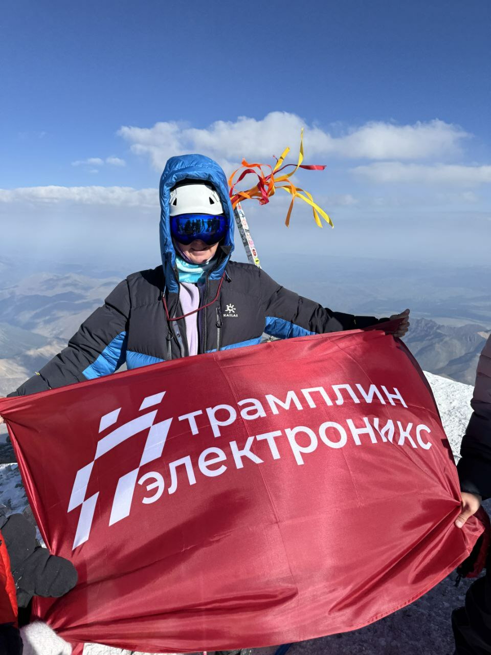 Очень символично, что почти в свою первую годовщину работы Вера развернула флаг «Трамплин Электроникс» над хребтами Кавказских гор.